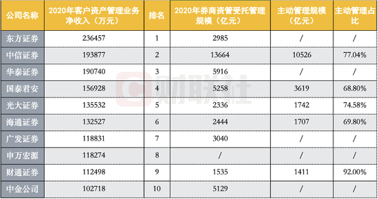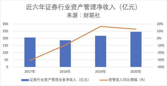 根据证券业协会数据,2020年,46家券商的资产管理业务净收入总额为246.24亿元,同比增长12.92%;单家券商资管净收入的中位数为27488万元,同比下跌1.99%。