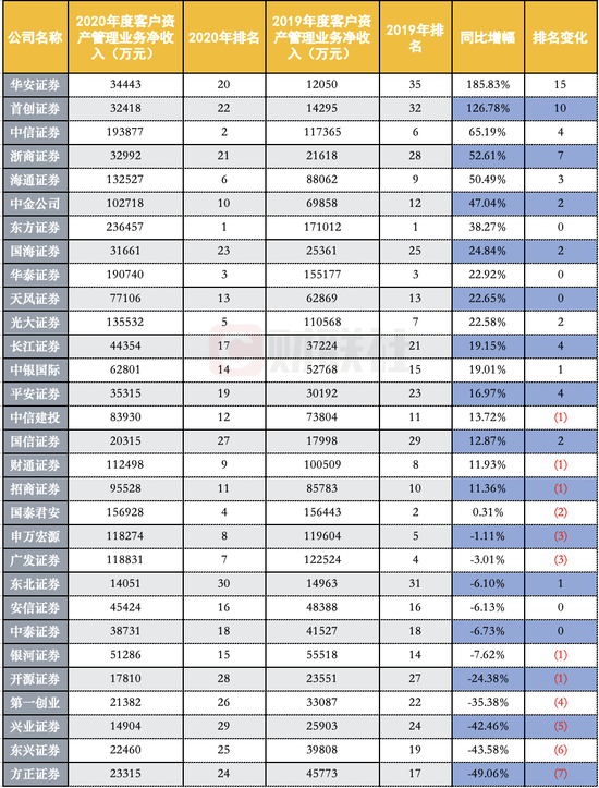 从增幅来看,仅有2家券商2020年净收入同比增幅超过一倍,分别是华安证券和首创证券,其增幅分别为186%、127%,行业排名分别上升了15位、10位。