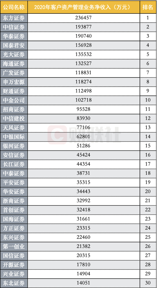 其中东方证券以23.65亿元的资管净收入连续4年位居行业首位,其次是中信证券和华泰证券,资管业务净收入分别为19.39亿元、19.07亿元。