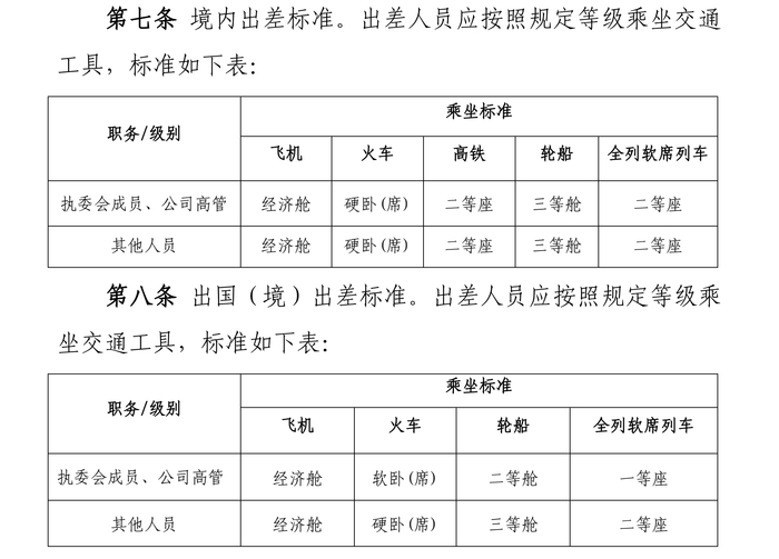 在境内出差交通工具方面,不论职务高低,均采用同一标准,《办法》显示,公司执委会成员和高管、其他人员在境内出差时,仅可乘坐飞机经济舱、火车硬卧(席)、高铁二等座、轮船三等舱、全列软席列车的二等座。