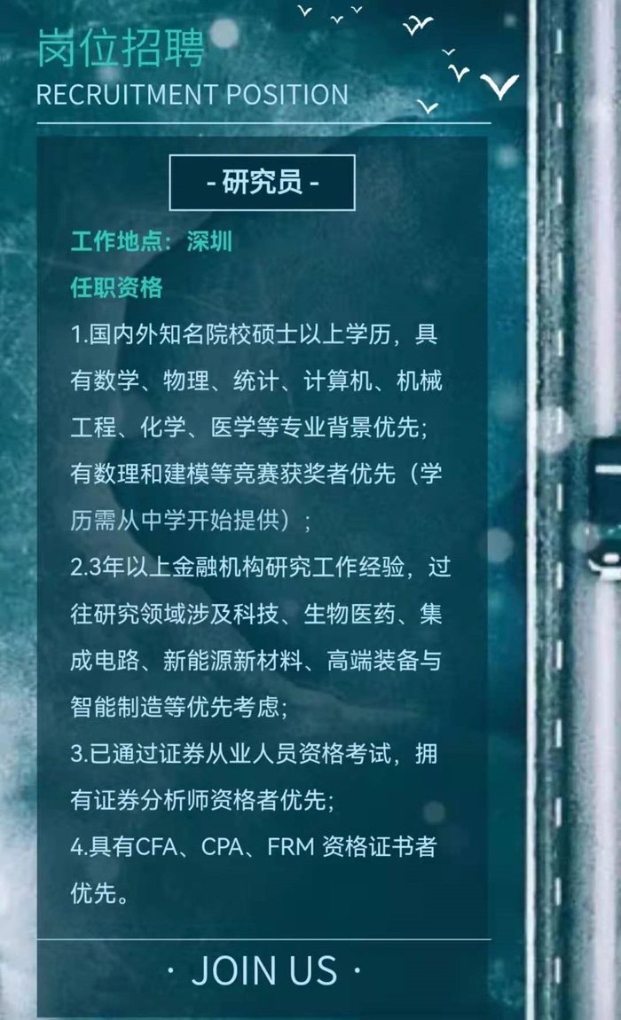 此外,研究员要求具有三年以上金融机构研究工作经验,过往研究领域涉及科技、生物医药、集成电路、新能源新材料、高端装备与智能制造等优先考虑。