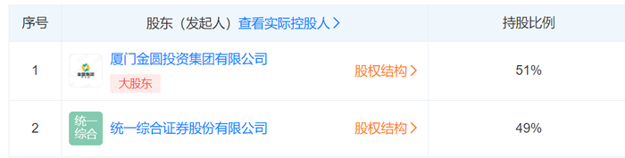 公开资料显示,金圆统一证券注册资本金为12亿元,由两大股东发起设立,分别是厦门金圆投资集团有限公司(持股51%)和统一综合证券股份有限公司(持股49%)。