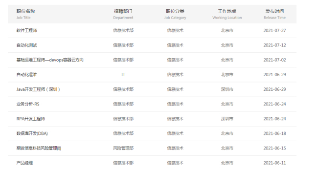中金公司官网显示,信息技术类涉及53个职位招聘,其中48个职位是今年发布的,信息技术部数量多达43个,其它部门包括IT、风险管理部、中金基金,招聘职位各有1个。