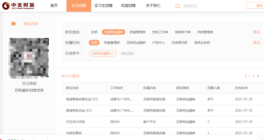 截至8月4日,中金财富互联网金融类职位招聘涉及21个职位,招聘29人,部分岗位招聘显示“若干”,招聘信息发布时间主要为7月29日之后,其中20个职位为7月29日、30日。