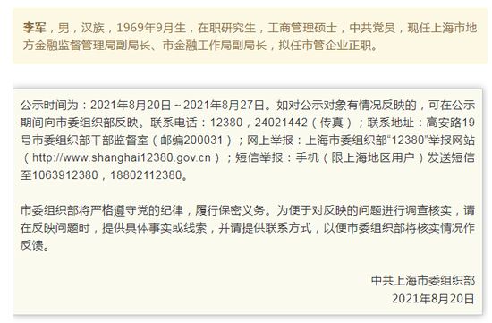 海通证券新任总经理人选落定。上海市委组织部8月20日发布的任职前公示显示,现年52岁的上海市地方金融监督管理局(上海市金融工作局)副局长李军,拟任市管企业正职。
