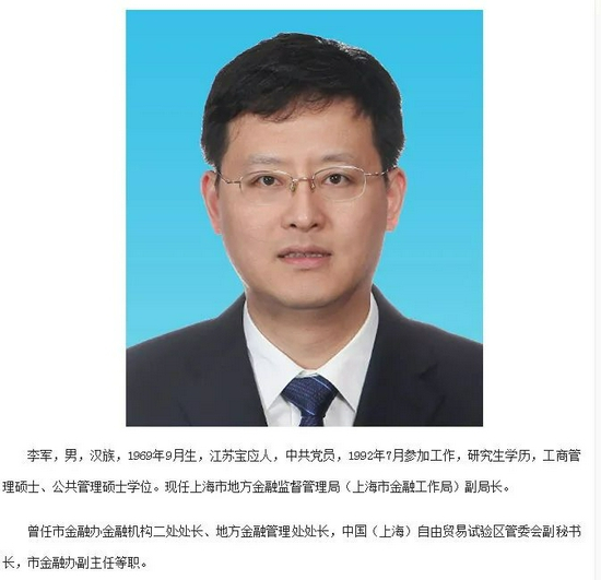 公开资料显示,李军,男,汉族,1969年9月生,江苏宝应人,中共党员,1992年7月参加工作,研究生学历,工商管理硕士、公共管理硕士学位。现任上海市地方金融监督管理局(上海市金融工作局)副局长。曾任市金融办金融机构二处处长、地方金融管理处处长。中国(上海)自由贸易试验区管委会副秘书长、市金融办副主任等职。