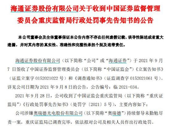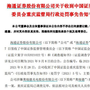9月28日晚间,海通证券发布公告称,公司收到了重庆证监局的《行政处罚事先告知书》,公司涉嫌奥瑞德持续督导未勤勉尽责一案,重庆证监局已调查完毕,依法拟对公司及相关人员作出行政处罚。