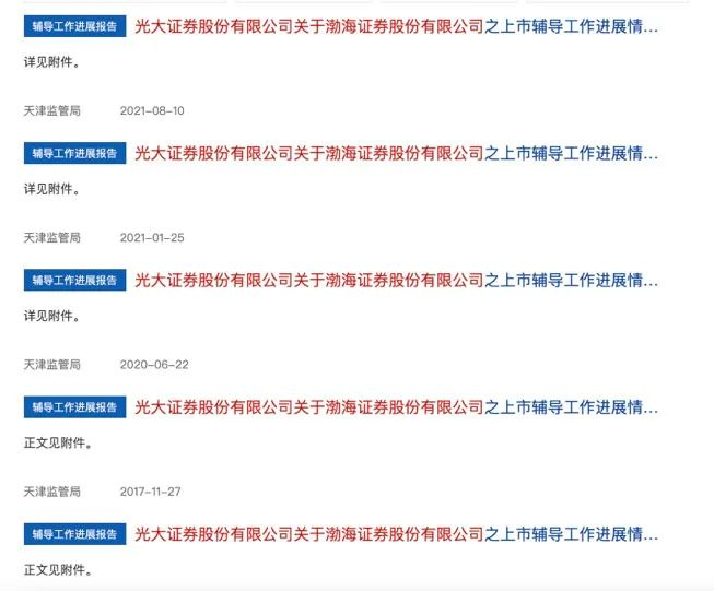 记者注意到,自2016年接受上市辅导到首次公开发行招股说明书,渤海证券整整花了5年多时间。作为渤海证券的辅导券商,光大证券于2016年10月与渤海证券签约后,相继于2017年5月,2017年11月,2020年6月,2021年1月和2021年8月共发布过5期辅导进展报告。