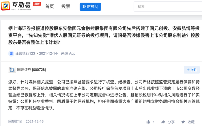 好不容易到2021年年底,上海证券报又连续撰文,质疑国元证券保荐IPO项目出现上市后业绩变脸,关联投资平台潜伏入股投行保荐IPO项目等问题。