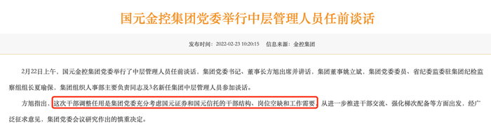 巧合的是,2月22日,国元金控集团党委曾举行中层管理人员任前谈话,彼时,其党委书记、董事长方旭在会上称,“这次干部调整任用是集团党委充分考虑国元证券和国元信托的干部结构、岗位空缺和工作需要,从进一步推进干部交流、强化梯次配备等方面出发,经广泛征求意见,集团党委会议研究作出的慎重决定。”