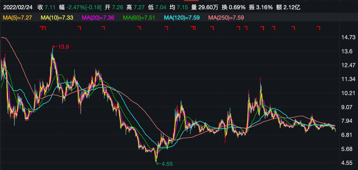 截至2月24日,国元证券最新收盘价为7.11元,相比于2020年9月11.47元的区间高点,已跌去40%。但其实自2020年三季度后,国元证券股价便开启了长期震荡下行,这也使得国元证券早年间的员工持股计划持续被套。