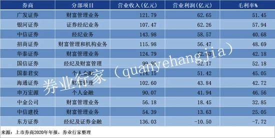 此前行家曾根据头部券商2020年报统计了头部券商各项业务的营业利润,引起深思的是,东方证券经纪业务的毛利率为负。