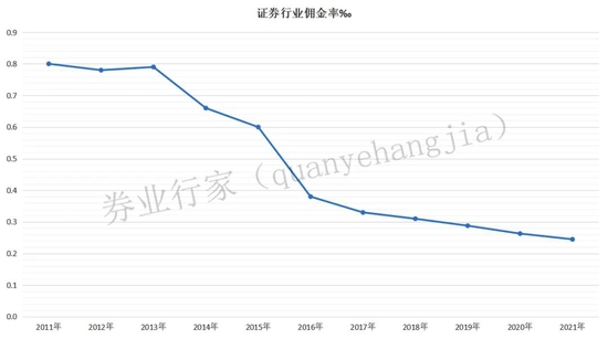 即使是从未炒股的行家,也深切的了解到,近年来券商佣金率逐年走低的事实。据湘财证券研报,在2011年,全行业平均佣金约为万分之八;而在2021年三季度,佣金率约为万分之2.45。