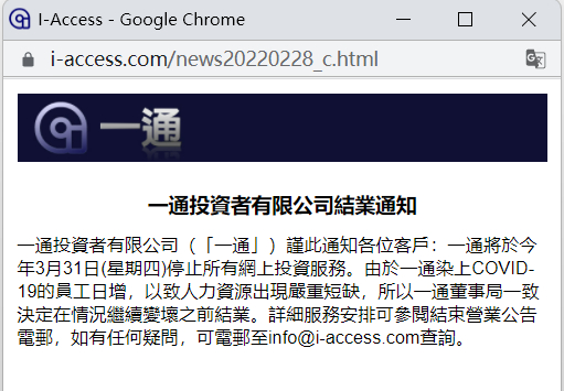 无需搭梯,行家顺利的登上了一通官网,发现了这则发布于2022年2月28日的结业通知,称其将在今年3月31日(星期四)停止所有网上投资服务。