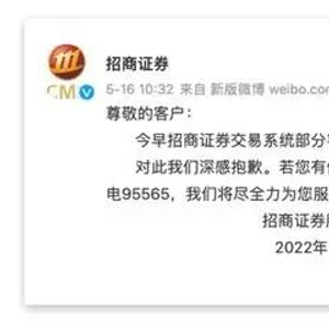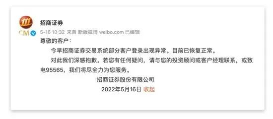 5月16日,大量投资者在网络上反映,招商证券系统崩溃,电脑和手机端均无法登录,造成无法正常交易。随后,招商证券在官方微博上回应,“目前已恢复正常”。