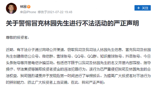 2021年7月,林园投资发布公告称,有不法分子通过网络公开渠道,冒充林园投资公司及林园先生开展电信诈骗活动,包括但不限于以林园投资及林园先生的名义开展内部荐股、指导操作、非法集资等骗取投资者资金的违法犯罪行为。