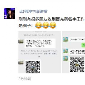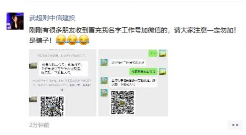 日前,中信建投研究所所长、TMT行业首席分析师武超则发布朋友圈称,很多朋友收到冒充其名字工作号加微信,“请大家注意一定勿加!是骗子!”