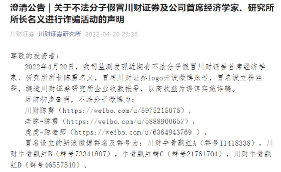 4月20日,川财证券就曾在官网发布公告称,其监测发现有不法分子假冒川财证券首席经济学家、研究所所长陈雳名义,冒用川财证券logo开设微博账号,冒名设立粉丝群,编造川财证券研究所企业收款账号,以高收益为诱饵实施诈骗。