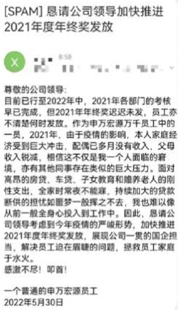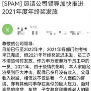 家庭收入锐减,年终奖迟迟不到,面临断供危险。当事人“叩首”恳请申万宏源公司领导“行行好吧”,发放2021年终奖。