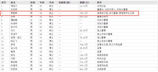 根据东方财富网信息显示,黄朝晖在2021年的薪酬为795.3万元,仅低于总裁助理徐翌成840.9万元,在业内来看也算得上数一数二的薪酬。