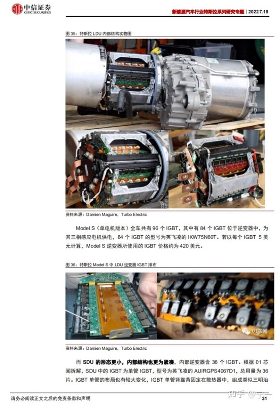 但是作为智能电动汽车核心部件之一的电动动力总成,特别是逆变器部分,报告中却没有提供多少原创内容。30-32页对特斯拉上一款车型Model S动力总成回顾,其内容和配图几乎都是从笔者之前的原创文章《特斯拉澎湃动力来自何方?》而来,仅是重组了语句,拆分了图片。报告不但没有给出引用出处,而且还把笔者原文中的一处笔误也原封不动的复制到报告中。希望中信证券在下次引用时,至少找笔者校对一下。