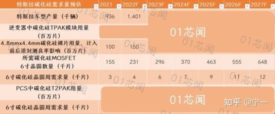 特斯拉的电动汽车对碳化硅的消耗量预估 (来源:01芯闻)