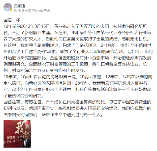 8月15日,国泰君安研究所所长黄燕铭在朋友圈发布了一段题为《国君十年》长达400多字的短文。在这篇短文中黄燕铭深情地回顾了他在国泰君安的职业生涯。