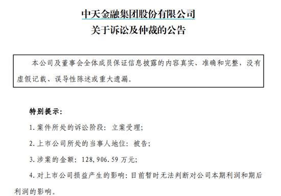 今年4月30日,中天金融曾披露称,该公司及控股子公司连续十二个月内累计发生的诉讼、仲裁涉案金额合计15.7亿元,占最近一期经审计净资产的13.20%。