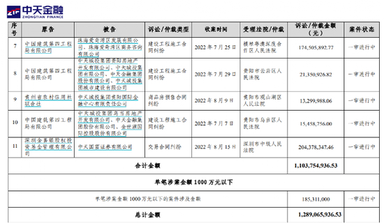 4月30日至今,除已披露过的重大诉讼案件外,中天金融及控股子公司累计新增诉讼及仲裁涉案金额合计12.89亿元,占最近一期经审计净资产的10.84%。其中,单笔涉案金额在1000万以上的多达11起,合计金额超过11亿元。
