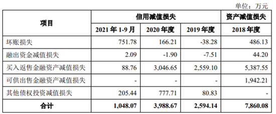 2019年1月1日起,公司实行新金融工具准则,公司以预期信用损失为基础,对应收款项、融出资金、买入返售金融资产、其他债权投资等金融工具提减值准备并确认信用减值损失。2019年和2020年,公司信用减值损失金额分别为2,594.14万元和3,988.67万元,主要系公司股票质押式回购业务所引起的买入返售金融资产减值损失。