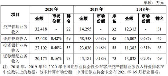 首创证券主要业务板块包括资产管理类业务、投资类业务、投资银行类业务和零售与财富管理类业务等。根据证券业协会的统计数据,2018年度、2019年度和2020年度公司重点业务的市场份额及行业排名情况如下表所示: