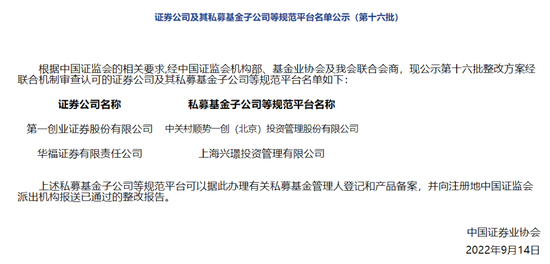 9月14日,中证协更新发布了第十六批《证券公司及其私募基金子公司等规范平台名单》。第一创业旗下的中关村顺势一创(北京)投资管理股份有限公司(简称:顺势一创),以及华福证券旗下的上海兴璟投资管理有限公司(简称:兴璟投资)赫然在列。