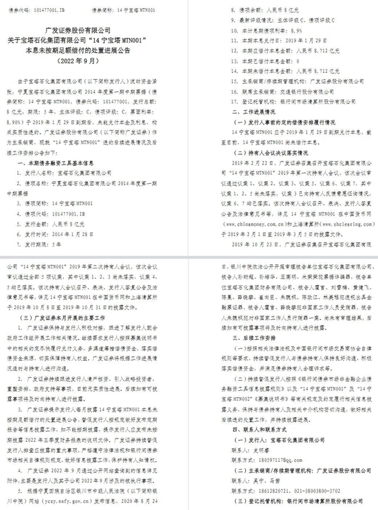 事实上,从2019年以来,广发证券每月均发布“14宁宝塔MTN001”和“14宁宝塔MTN002”的违约进展公告,目前能查到的就多达82份。