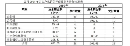 同样是2014年,广发证券的债承业务翻番:债券承销规模由2013年的309.69亿元激增至630.65亿元。中期票据项目“从无到有”,首次开张便完成4单,合计19.4亿元。债承业务收入3.71亿元,同比增长87.78%。