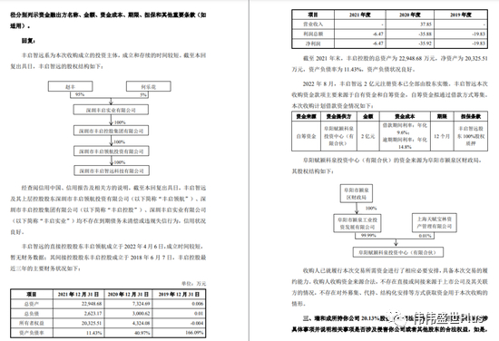 至于本次收购资金款项,主要来源于自有资金和自筹资金。其中2亿元的自筹资金,为丰启智远股东以100%股权质押,向阜阳赋颍科泉投资中心(有限合伙)(简称:赋颍科泉)借款,借款利率为9.6%,逾期利率14.8%。而赋颍科泉的资金来源,则是阜阳市颍泉区财政局。