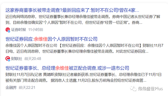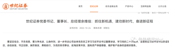 11月2日,股东方前海金控给世纪证券高管召开内部会,宣布余维佳暂时不能履职的消息,近日已由前海金控高管代为履行董事长职务。余维佳最后一次公开露面是10月17日组织带领公司全体高管学习二十大报告。目前世纪证券公司官网关于余维佳的新闻报道并未删除,因此也可能只是暂时的配合调查,我相信以其为人处世风格,浸淫行业多年,大风大浪过来的业内翘楚,应该没有太大问题。