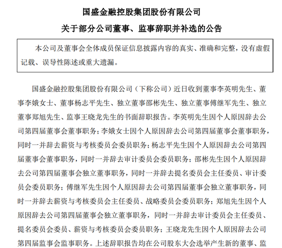 国盛金控此次辞职的董事分别为李英明、董事李娥、董事杨志平;辞职的独董包括邵彬、傅继军、郑旭;辞职的1位监事为王晓龙。除了李英明、李娥、王晓龙继续担任公司及子公司其他职务外,其他董事将不再担任公司任何职务。
