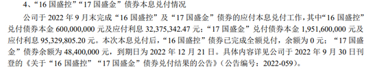 目前国盛金控的债券兑付压力正逐步得到化解。以“16国盛控”和“17国盛金”为例,截至2022年9月底,“16国盛控”本金及利息共6.33亿元已经全额兑付;“17国盛金”已完成本金约19.51亿及应付利息0.95亿元进行了兑付,本次本息兑付后,“17国盛金”债券余额为未回售登记的48.4万张债券(面值总计4840万元),到期日为2022年年底。