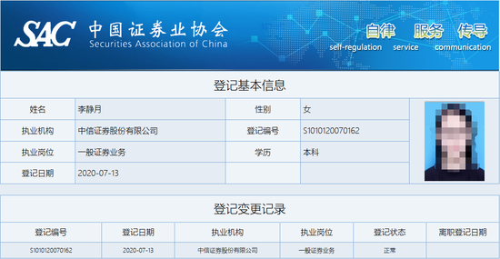 根据中国证券业协会公示的从业人员基本信息,李静月的执业机构为中信证券股份有限公司,执业岗位为一般证券业务,登记日期为2020年7月13日,登记状态正常。