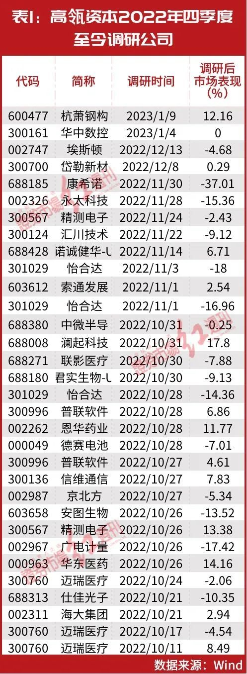 不过,据Wind资讯数据统计,顶级投资机构高瓴资本2022年四季度依旧保持了积极研究布局的态度,期间对24家公司进行了调研。且2023年开年的第二天,高瓴资本即迅速投入调研工作,奔赴现场对华中数控进行了调研。1月9日,又参与了杭萧钢构的调研活动(见表1)。