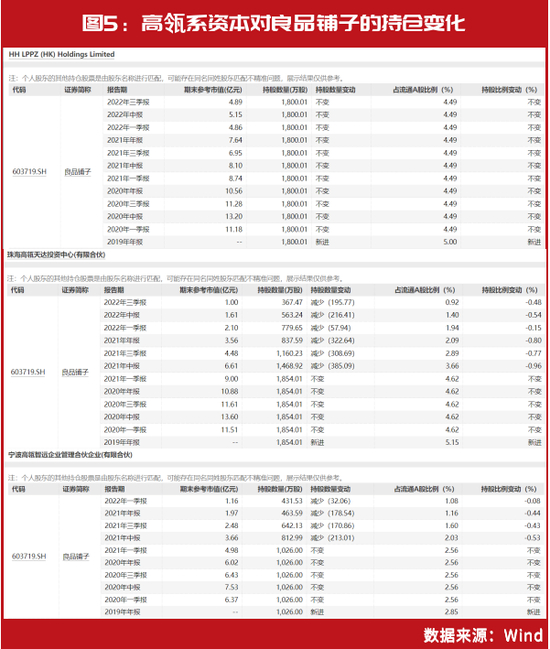 2019年四季度,珠海高瓴天达投资中心、HH LPPZ (HK) Holdings Limited(香港高瓴)、宁波高瓴智远企业管理合伙企业三只高瓴系资本同时出现在良品铺子前十大股东之列,分别位居第三位、第四位和第七位,但随着2021年二季度珠海高瓴天达投资中心、宁波高瓴智远企业管理合伙企业开启减仓行动后,截至2022年三季度末,珠海高瓴天达投资中心已降至公司第十大股东,宁波高瓴智远企业管理合伙企业虽然2022年三季度末仍持有公司20369万股的股份,但自2022年二季度末,即已经退出了公司的前十大股东。相较之下,只有HH LPPZ (HK) Holdings Limited(香港高瓴)的持仓一直未出现变动,2021年二季度末,持股超过珠海高瓴天达投资中心,成为了公司的第三大股东(见图5)。