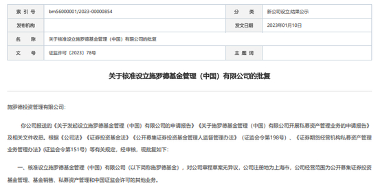 今年1月10日,证监会核准施罗德投资管理有限公司(Schroder Investment Management Limited)出资2.6亿元人民币,全资设立施罗德基金管理(中国)有限公司(简称:施罗德基金)。