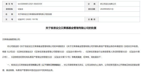 2020年8月,贝莱德金融管理公司(BlackRock Financial Management, Inc.)获准设立贝莱德基金管理有限公司(简称:贝莱德基金),注册资本3亿元人民币。