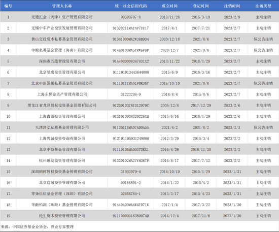 话说,春节前夕,行家曾留意到中基协因异常经营等原因同日注销了1445家私募机构。节后归来,中基协又有了更新,截至2月9日共有19家,尚未满一屏。