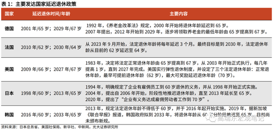 2020年以来,迫于老龄化和财政支出的双重压力,多国提出进一步延长退休年龄。例如,美国计划在2027年将退休年龄自66岁推迟至67岁;法国计划自2023年至2030年将退休年龄自62岁分阶段推迟至64岁;德国计划于2029年将退休年龄延长至67岁;英国计划在2035年将法定退休年龄提高到68岁;韩国政府拟到2033年,将退休年龄从60岁分阶段推迟至65岁;日本在2020年更是提出,“企业有义务达成雇佣劳动者工作到 70 岁”。