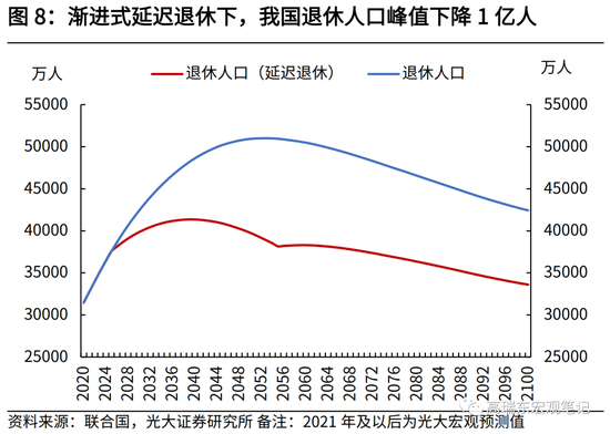 实施渐进式延迟退休政策,有效避免大规模“退休潮”的出现。根据我们的测算,2022年,我国退休人口总数为3.4亿人。若2025年-2055年期间,实施65岁渐进式延迟退休,则退休人口峰值将自5.1亿人(2053年)下降至4.1亿人(2039年),对应峰值下降1亿人次。