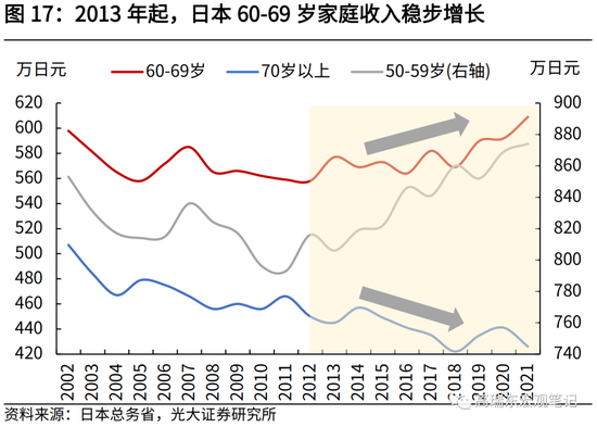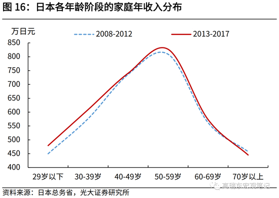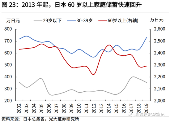 从日本各年龄段家庭调查数据看,2013年延迟退休政策实施后,60岁-69岁老年人口收入稳定增加、消费倾向相对稳定,总体储蓄明显增多。而青壮年群体由于养老负担、税负加重,消费倾向普遍性回落,多数储蓄也小幅增加。