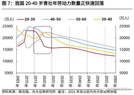 此外,当前我国劳动年龄人口峰值已过,低生育率和育龄女性人口的下降,进一步导致新增劳动力减少。“退休潮”加速到来,意味着未来劳动力市场将从供过于求逐步转向供不应求。我们参考联合国对于生育率、死亡率的假设,使用队列要素法预测我国的人口结构变动趋势。在中性情景下,我国人口峰值基本在2022年见顶,为14.13亿人。其中,20-30岁、30-40岁劳动力人口接连于2013年、2020年见顶并加快回落,劳动年龄人口步入负增长时期。