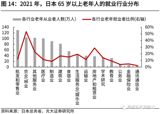 从行业分布看,日本老年人就业多集中在高劳动力需求、低附加值的生活类服务业。根据日本总务省披露的数据,2021年,日本65岁以上老年人就业在第一、二、三产业的分布比例分别为11.8%、19.7%、68.5%。服务业中,老年人就业行业以批发零售、医疗、食宿、娱乐等生活性服务业为主,运输、教育、金融保险、信息通信等生产性服务业分布较少。