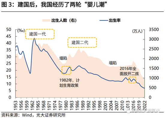 “十四五”期间,“建国一代”开始集中迈入60岁阶段。1962年-1975年间,我国年平均出生人数高达2600万人,共计3.7亿人,将在2020-2035年内,推动一轮庞大的“退休潮”。2022年,我国已经接近中度老龄化社会,我们预计将在未来15年内加速步入重度老龄化社会。